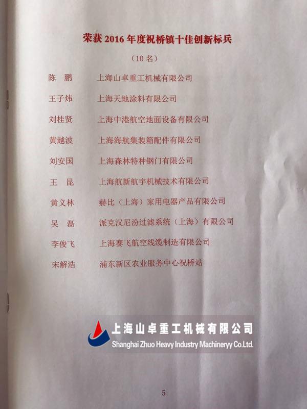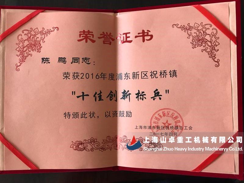 熱烈祝賀上海山卓重工陳鵬獲得2016年度浦東新區(qū)祝橋鎮(zhèn)“十佳創(chuàng)新標兵”